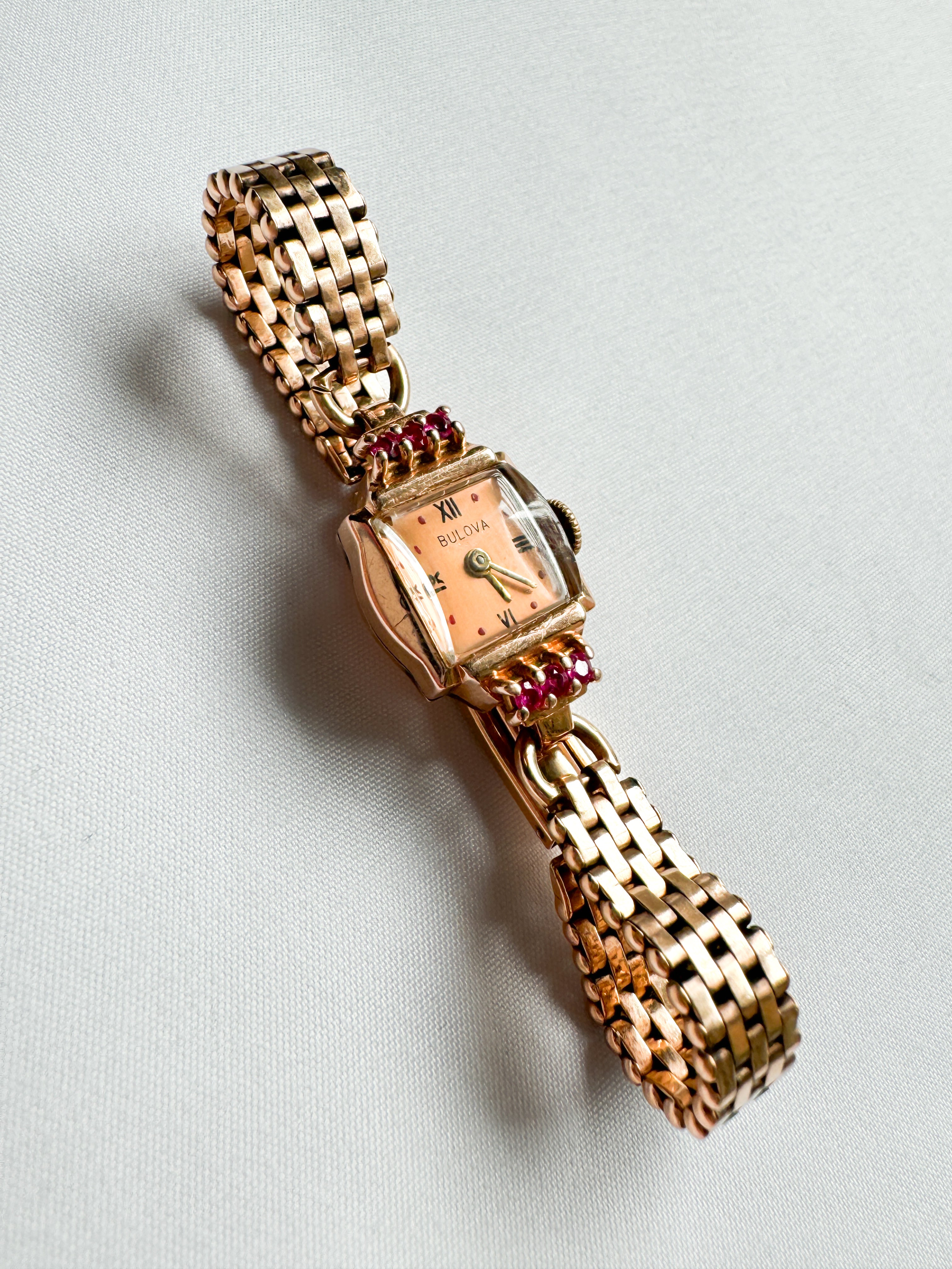 • Vintage 14k Gold Ruby Bulova Watch 6"